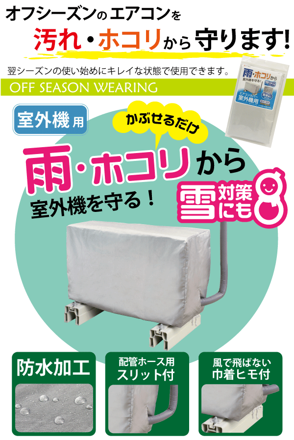 室内機カバーもあります! 商品情報 かぶせるだけ!簡単取り付け!! エアコンの室外機を雨・ホコリ・雪などからの守る、防水加工のカバーです。