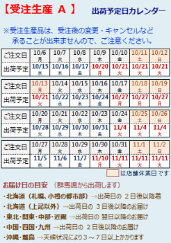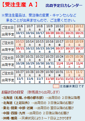 複数の商品をご注文頂いた場合などは遅い方の納期に合わせて出荷しますので商品ごとのカレンダーと、出荷日が異なる場合があります。